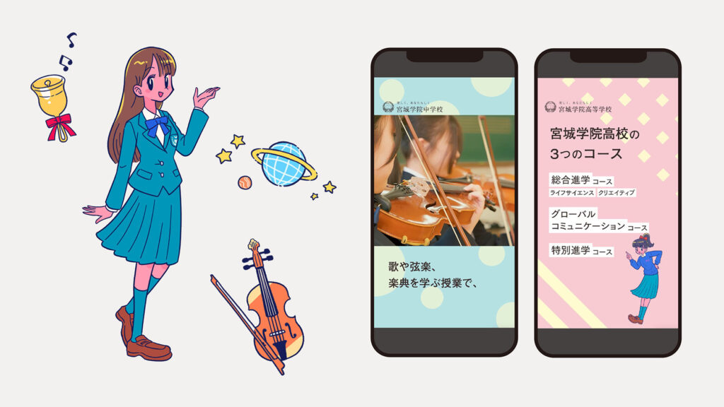 実際の生徒をキャラクターとして登場させたSNSショートムービー制作を行いました。学校紹介を中学校は学びの特色毎、高等学校はコース毎にコンパクトなムービーにまとめ、ターゲットの興味にダイレクトに届ける設計としました。今後、開発したキャラクターを活用した新たな広報を進めていく予定です。